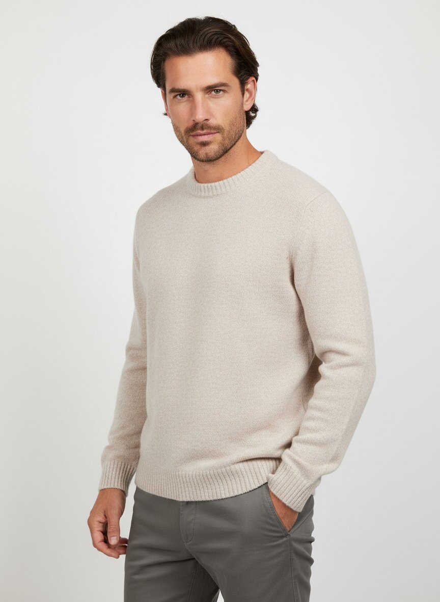 Sandfarbener Wollpullover mit klassischem Rundausschnitt