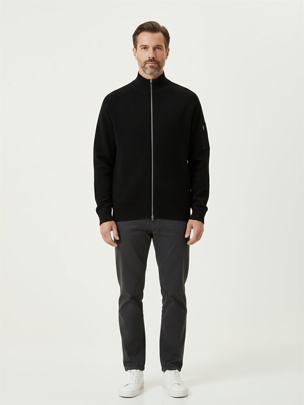 Ein eleganter Stehkragen und der praktische Zwei-Wege-Reißverschluss definieren diesen Cardigan als modernes Layering-Piece mit Charakter. Die reine Wolle im feinen Rippstrick bietet wärmende Isolationskraft und liegt dabei angenehm leicht auf der Haut – ideal für variable Temperaturen. Raglanärmel ermöglichen freie Bewegungsfreiheit, während die seitlichen nahtfeinen Reißverschlusstaschen und die zusätzliche Ärmeltasche den Alltag praktisch machen. Die durchdachte Konstruktion verbindet Business-Eleganz mit alltäglicher Funktionalität ohne Kompromisse. BOGGI Milano entwickelt seit 1939 technische Textilien, die italienische Schneidertradition mit moderner Ingenieurskunst vereinen – dieser Cardigan verkörpert diese Philosophie in schwarzer Perfektion.Unser Tipp: Kombinieren Sie den Cardigan über einem weißen Hemd mit einer anthrazitfarbenen Wollhose und Loafern für einen zeitlosen Business-Casual-Look, der auch in der kalten Jahreszeit Eleganz bewahrt.