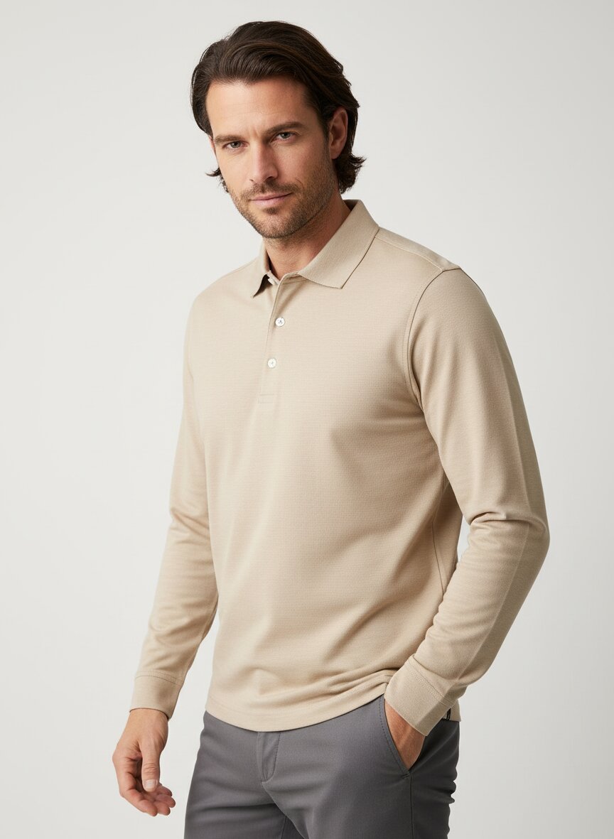 Das beige-melierte Gewebe aus japanischem Jersey zeigt sich mit feiner Piqué-Struktur und dezenter Tiefe. Die Baumwoll-Polyester-Mischung fühlt sich weich an, transportiert Feuchtigkeit zuverlässig nach außen und trocknet besonders schnell. Mit Kentkragen und geknöpften Ärmel-Manschetten wirkt das Langarm-Polo smart genug für Business-Casual und bleibt dabei herrlich unkompliziert. Die atmungsaktive Qualität macht es zum idealen Begleiter für klimatisierte Räume oder milde Herbsttage. BOGGI Milano verbindet seit 1939 italienische Schneiderkunst mit technischen Innovationen – über 500 Textilvarianten entstehen für den aktiven Geschäftsmann. Wenn die Temperaturen fallen, funktioniert das Polo perfekt unter einem Merino-Pullover oder einer ungefütterten Jacke.Unser Tipp: Tragen Sie das Polo zu einer anthrazitfarbenen Wollhose und braunen Ledersneakern für einen modernen Business-Casual-Look.