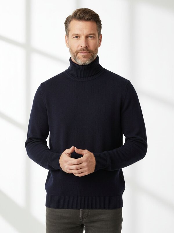Marineblaues Rollkragen-Statement aus Merinowolle extrafein
