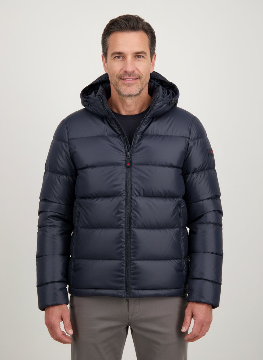 Die matt schimmernde Mikrofaser-Oberfläche in tiefem Dunkelblau verleiht dieser Daunenjacke eine elegante, technische Optik. Das wasserabweisende Polyamid-Gewebe schützt die hochwertige 80/20 Daunenfüllung zuverlässig vor Nässe, während die Daunen für wohlige Wärme ohne Gewicht sorgen. Mit ihrer cleanen Silhouette und dem Zwei-Wege-Reißverschluss passt die Jacke sowohl zum Business-Outfit als auch zur Freizeitgarderobe. Die angeschnittene Kapuze, verdeckte Seitentaschen und der innen regulierbare Saum zeigen die durchdachte Funktionalität bis ins Detail. PEUTEREY verbindet seit 2002 toskanische Textiltradition mit alpiner Inspiration vom Mont Blanc – eine Synthese aus italienischer Eleganz und technischer Perfektion. Die kürzere Rückenlänge von 63 cm macht die Jacke ideal für den urbanen Herbst und Winter.Unser Tipp: Kombinieren Sie die Jacke zu einem grauen Rollkragenpullover und dunkler Jeans für einen stilvollen City-Look.