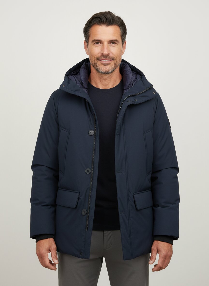Marineblaue Daunenjacke mit versteckten Funktionsdetails