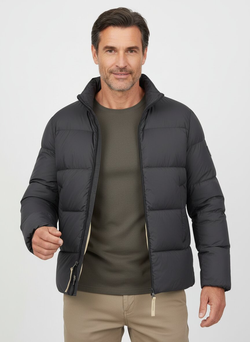 Die markanten breiten Steppbahnen verleihen dieser schwarzen Daunenjacke eine moderne, geradlinige Optik. Das federleichte Polyester-Obermaterial schützt zuverlässig vor Wind, während die hochwertige 90/10-Daunenfüllung wohlige Wärme ohne Volumen spendet. Der Zwei-Wege-Reißverschluss und die seitlichen Druckknopftaschen machen sie zum funktionalen Begleiter für urbane Wintermomente. Stehkragen, elastische Ärmelbündchen und der weitenregulierbare Saum sorgen für optimalen Wärmeschutz an kalten Tagen. Woolrich beweist seit 1830 pennsylvanische Outdoor-Expertise – hier trifft amerikanisches Heritage auf zeitgemäße Funktionalität. Ideal für die Übergangszeit und als wärmende Schicht unter dem Mantel an frostigen Wintertagen.Unser Tipp: Tragen Sie die Jacke über einem Merino-Rollkragenpullover und kombinieren Sie dazu eine graue Flanellhose für einen eleganten Winter-Look.